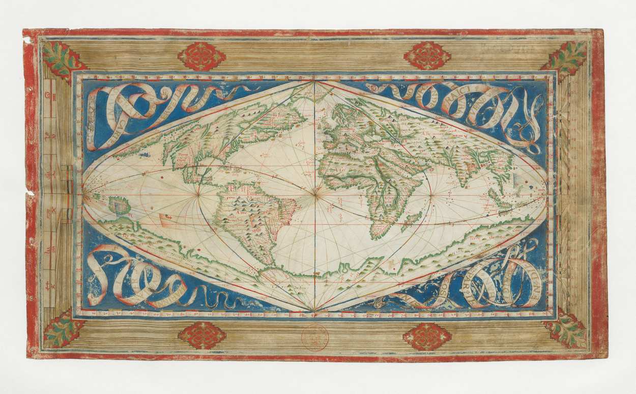 This world map, made in Dieppe, northern France, in 1570, is thought to be the only extant map by Jean Cossin (also seen as Jehan and Johan Cossin), a hydrographer from Dieppe known in his time as an excellent maker of marine maps.