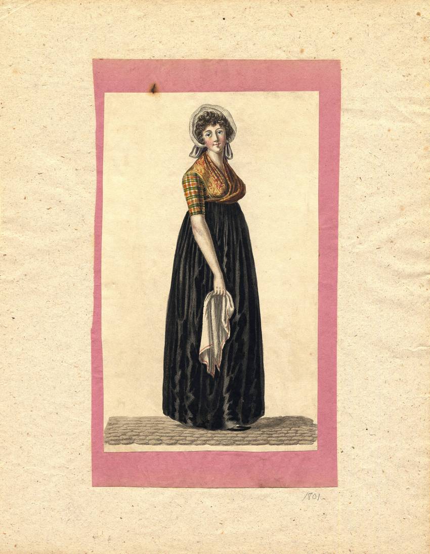 A woman wears a loose white bonnet on her head and long gown. The bodice and sleeves of her dress are green, red, yellow, and gold plaid and she wears a red and gold paisley scarf tucked into the waist of her empire-waist floor length black skirt. She holds a white towel with a red stripe at the hem in her right hand. One black shoe shows at her hem as she stands on a cobblestone road. The plate is mounted on rose colored tissue paper on top of natural colored paper. There are a couple of burn marks on the plate and its mount.