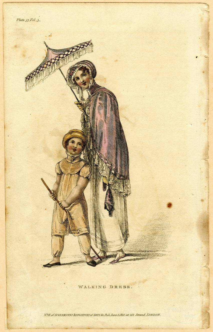 A young woman and small child wear their London summer walking clothes. The woman wears a long, white dress trimmed with two bands of ribbon at the hem. Over her dress she wears a lavender, high-collared, lace-trimmed mantelet or cape tied at the neck. Her white lace bonnet is trimmed with ruched bands of lavender ribbon and pink flowers. She wears lavender slippers and yellow gloves, and she carries a tasseled lavender reticule and a parasol trimmed with white lace and a band of trimming forming a pattern of x’s.