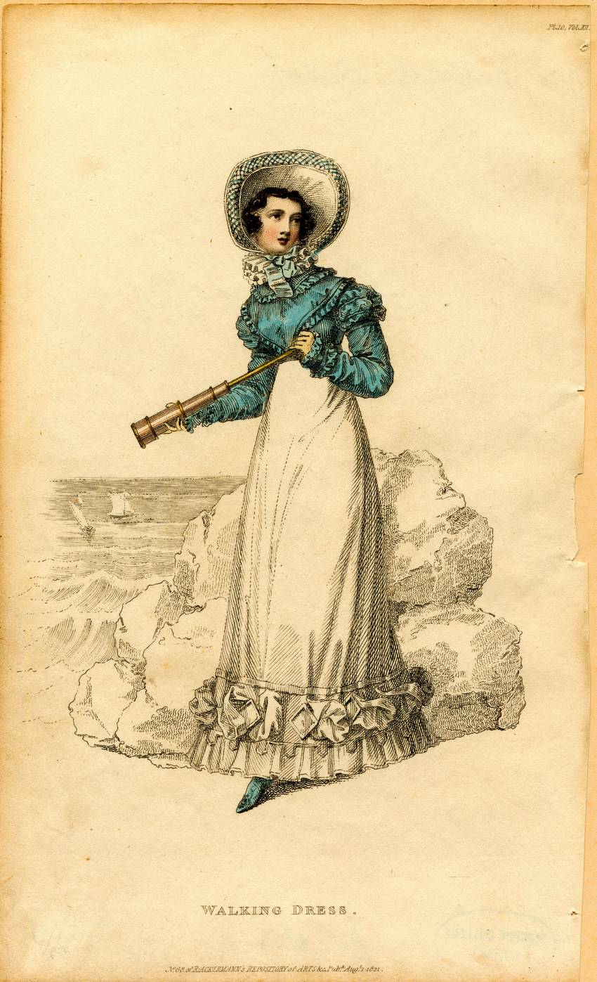 The jacket collar is edged with a similar ruffle. A white double ruff is visible at her neck. She wears a large brimmed, white bonnet with a blue and white woven design on the brim. A wide blue ribbon ties the bonnet under her chin. One blue shoe can be seen from beneath her dress. She holds a telescope in her hands and stands in front of a large boulder near the seashore.