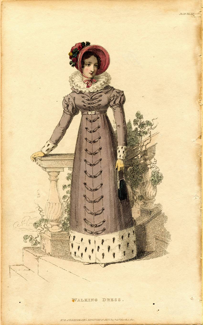 A woman appears in a walking dress from 1822. She wears a purple long-sleeved empire-waist dress with ermine fur on the cuffs of the Juliet sleeves and at the bottom of her dress. Short ribbons are attached to the bodice, down the front of the dress, and on the puffs of the sleeves, with a small purple bead anchoring either end of the ribbon to the dress. On the bodice and down the skirt, these short ribbons are arranged horizontally to resemble toggles holding the dress closed.
