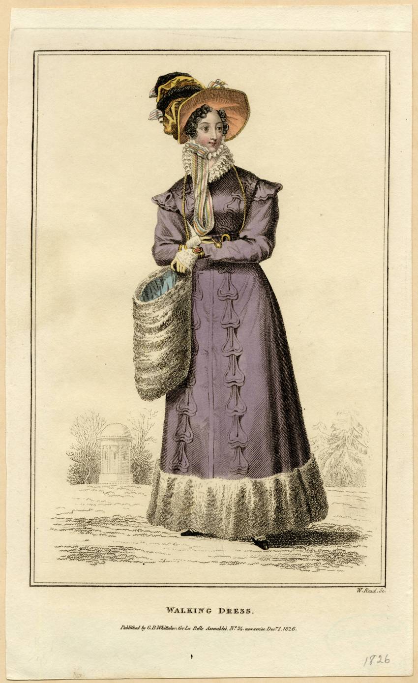 In her left hand, she holds a white, fur muff lined with pale blue. Her other hand holds an round gold object, possibly a monocle attached to the chain. The woman is outside: wintry trees and a small, domed building are visible in the distance, and she stands on grass. Written in pencil in the lower, right-hand corner is “1826”.