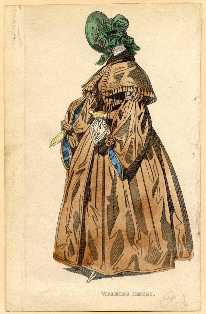It is lined in blue and fastens only at the wrists with a brown rosette. The collar is similarly a double collar, with a wide, lower cape collar and a narrower upper collar. The woman wears long, pointed, white shoes, yellow gloves, and a green bonnet trimmed with green bows and sprays of pink flowers. “Feb” is written in pencil in the lower right.