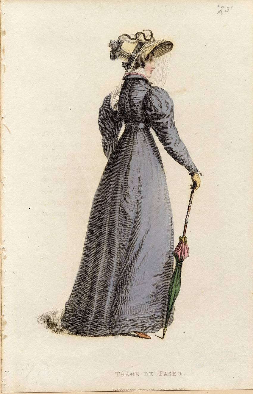 A woman in walking dress for 1825. She wears a wide brimmed, straw hat with a band of navy blue ribbon. A sheet, white veil cascades over the left side of the brim and a small bit down the back of her shoulder. The collar of her dress is folded over revealing the edge of a pink collar and the top of a white ruffled collar. Her dress buttons up the back of her bodice from the waist to the collar.
