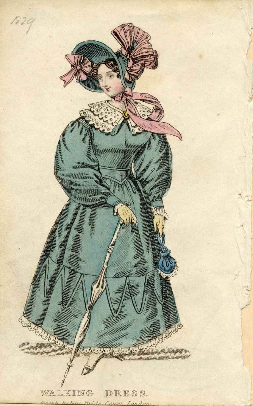 A woman poses in a walking dress for 1829. She wears a wide brimmed, blue bonnet with large, pink bows adorning the crown and the underside of the brim. A pink ribbon secures the hat under her chin. The collar of her dress consists of two tiers of white, eyelet lace. It lies flat against her shoulders and chest. There is a gold brooch at the center of the collar. Her dress is deep teal blue with long, puffed gigot sleeves. The cuffs are edged with white ruffles. She wears pale yellow gloves and holds a white parasol in one hand and a blue handbag with lace trim in the other. The bodice is very plain with a single seam down the center. The skirt has a zigzag pattern about midway down. The hem is trimmed with white, eyelet lace. She wears a pair of black flats over white stockings.