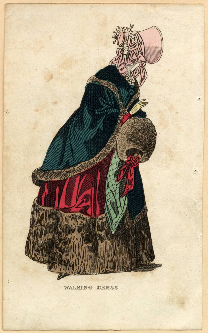 The woman wears a crimson walking dress with a lacy white collar and a wide band of brown fur at the hem. She carries a matching brown fur muff trimmed with a crimson bow. Over her dress she wears a deep green, fur-edged cape with a brooch at the neck. The woman has pointed, black shoes, yellow gloves, and a pale pink poke bonnet decorated with a rear ruffle, pink bows, and sprays of white flowers. A light green, checked cloth hangs below the muff; perhaps it is a scarf of some sort.