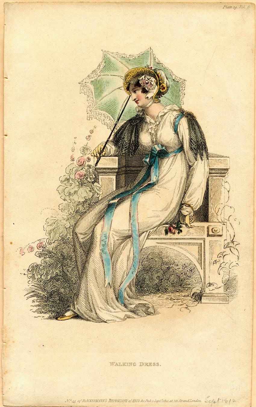 A woman wears a walking dress from 1812. The woman wears a long, white, empire-waist dress with a ruffled collar. She wears a white bonnet with a yellow straw brim. She wears yellow gloves, yellow shoes, a black shawl, and a gold bracelet on her left wrist. The donor has written “Sept 1812” in the bottom right hand corner.