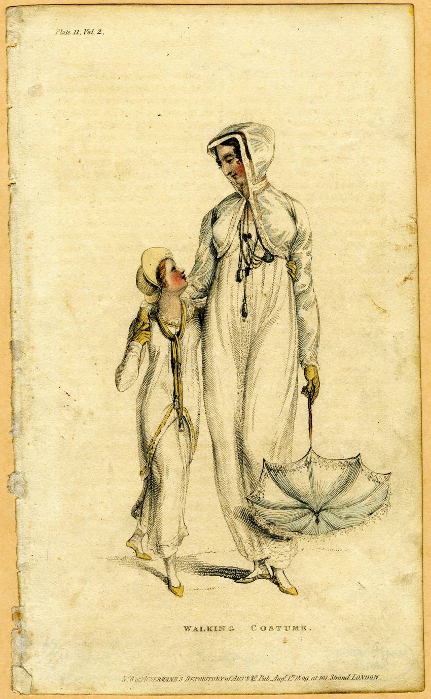A dark-haired young woman and blond-haired girl look at one another while walking in London fashions of 1809. The woman wears a long, white, unstructured dress with an Empire waistline and a long sleeved hooded pale blue spencer jacket tied at the neck with tasseled ties. The jacket is trimmed with bands of brown on the hood and bodice, She wears a of long necklace with a cross. A small purse or watch is pinned to her bodice with a dark red bow.
