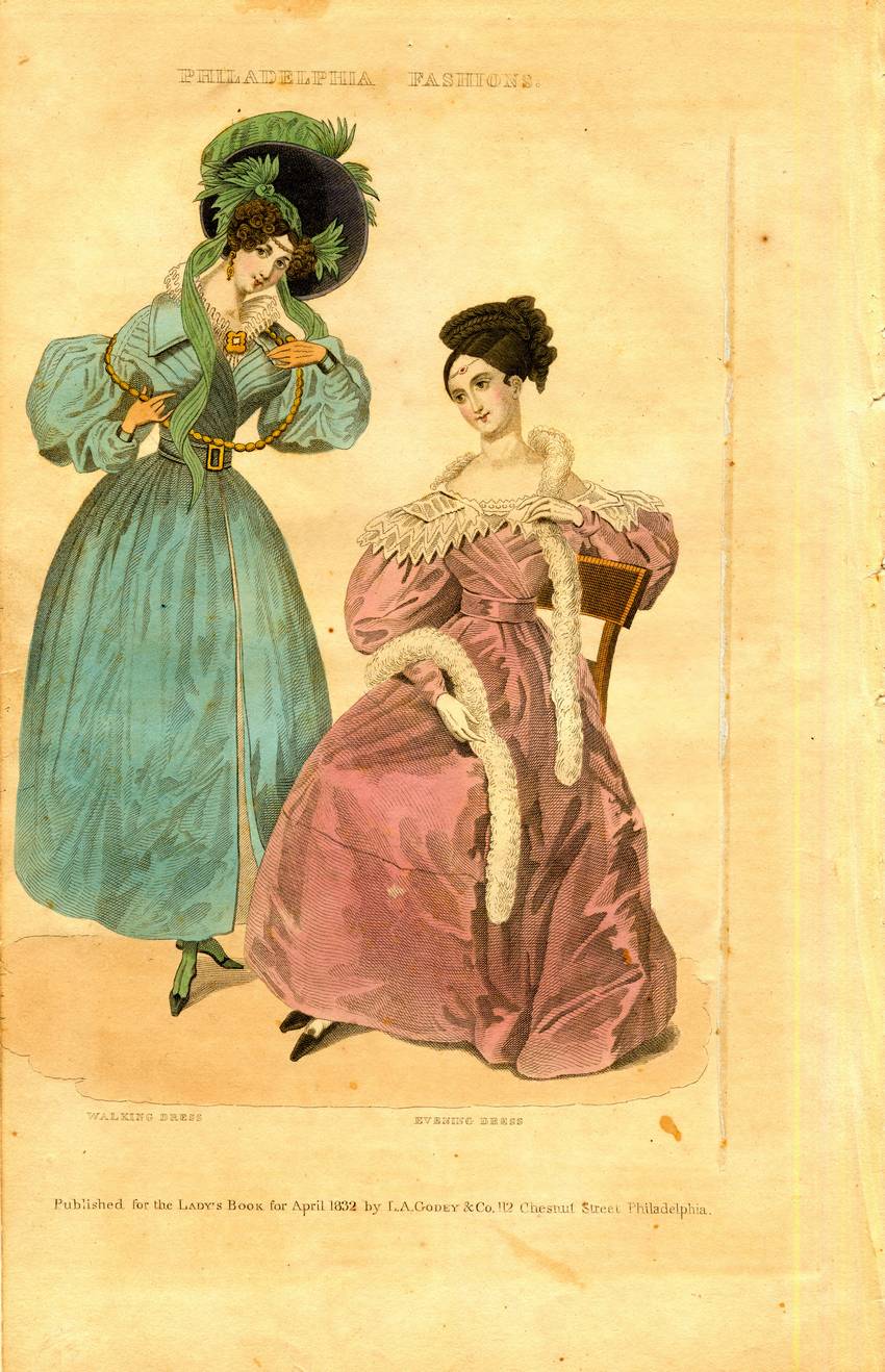Two women in a walking dress and an evening dress from Philadelphia in 1832. The woman on the left wears a blue, long-sleeved walking dress. She has a white ruff collar with a gold brooch in the center. The collar of her dress is folded down and the bodice of her dress is pleated, with one side crossing over the other. Her sleeves are in the leg-of-mutton style. She wears a blue ribbon belt with a rectangular gold buckle.