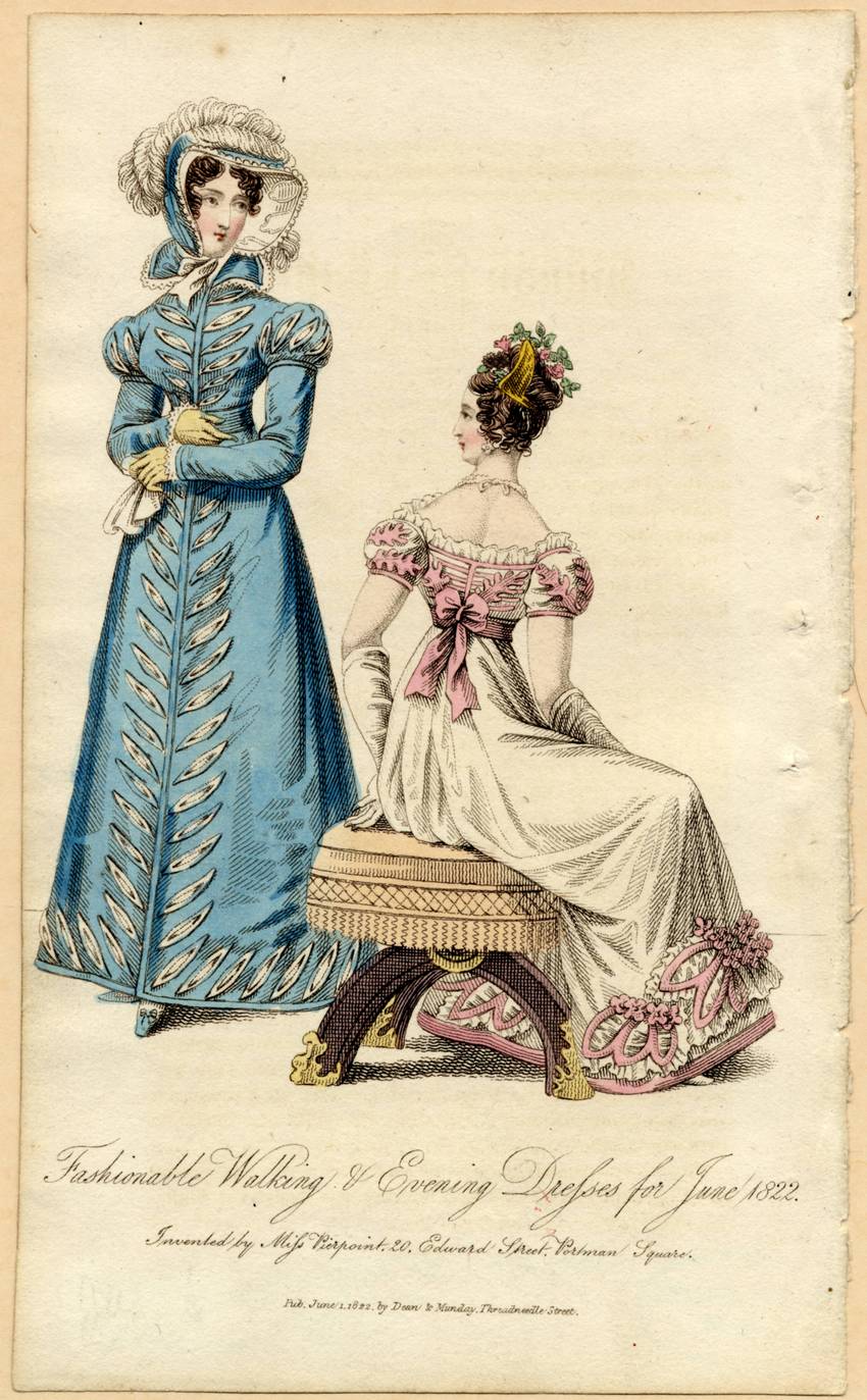 The woman on the left wears a blue walking dress with an empire waist, long sleeves, and a high collar. The dress fastens down the front and there are large, white, leaves on either side. The leaves start at the neck and end at the hem, following the hem of the skirt. The sleeves puff at the shoulders and are decorated with the same leaf pattern.