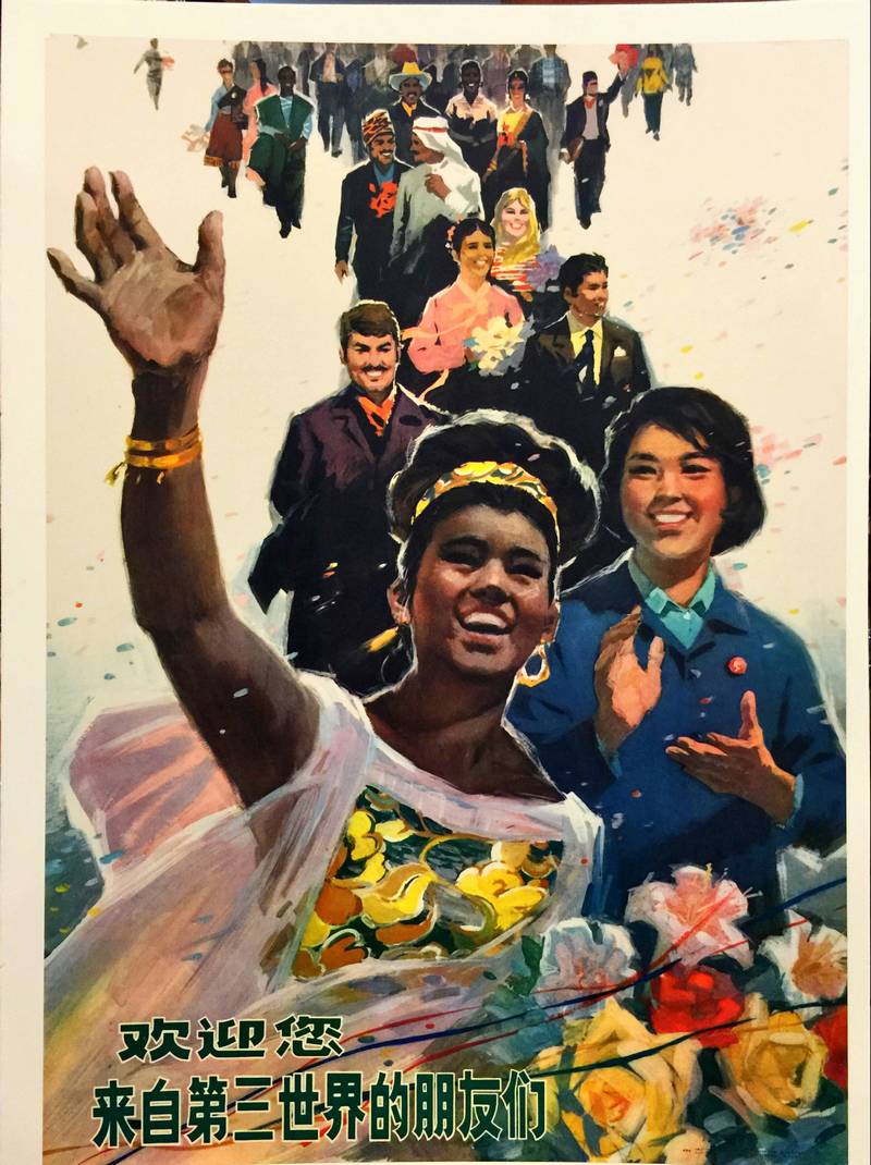 Original Chinese propaganda poster from the late 1970s, titled “Welcome, Friends from the Third World”. The poster was published by the Shanghai People’s Publishing House (Shanghai renmin chubanshe). The work reflects China’s foreign policy at that time, based on Mao Zedong’s “Three Worlds Theory,” which sought to position China as an ally and leader of developing nations in Asia, Africa, and Latin America against the imperialism and hegemony of superpowers.