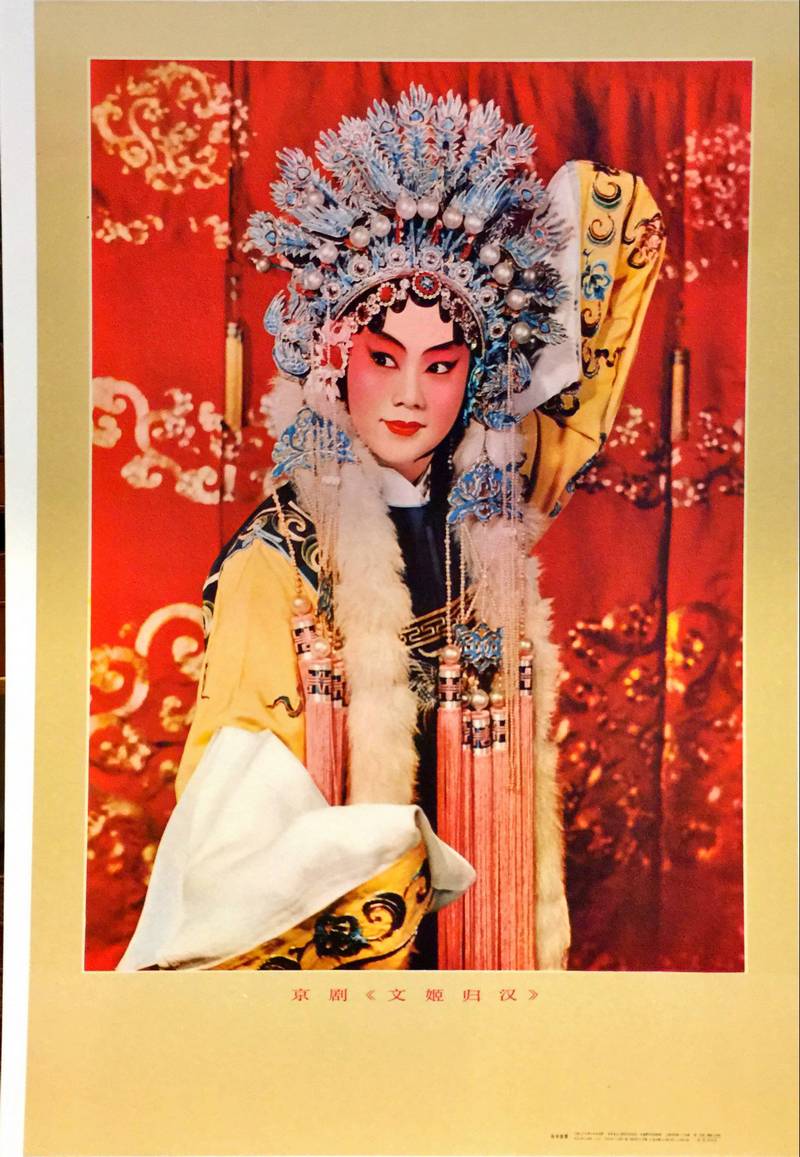 This poster depicts the Peking Opera play titled Wenji Gui Han, which translates as “Wenji Returns to the Han”. The image portrays the protagonist, Cai Wenji, a real historical figure and poet of the Eastern Han dynasty. The story focuses on Cai Wenji, who was kidnapped by Xiongnu nomadic tribes during a period of political chaos and lived among them for twelve years. Later, she was rescued by Cao Cao, who paid a ransom so that she could return to her homeland.