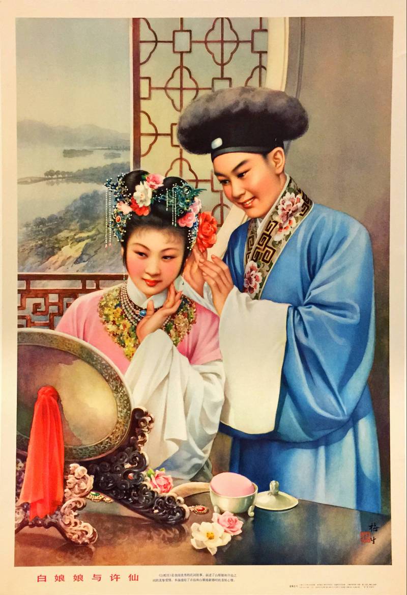 This artwork depicts Bai Suzhen (left), a white snake spirit, and her mortal husband, Xu Xian (right). The image captures a tender moment of affection between the couple, with the female figure tending to her hair while her husband watches.