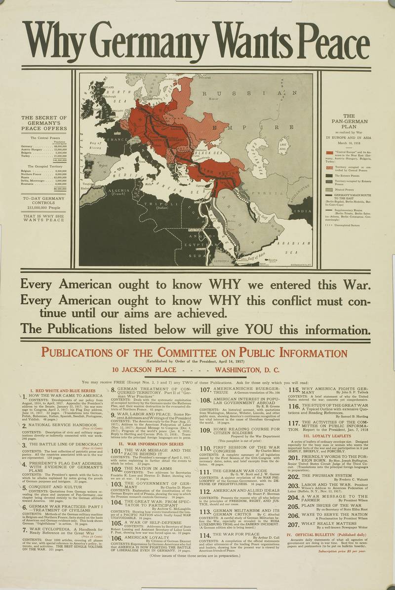 The ironic title “Why Germany Wants Peace” suggests that German peace pleas were false and served only to consolidate their territorial gains. The text states that Americans should know why they entered the war and why they should continue fighting until total victory.