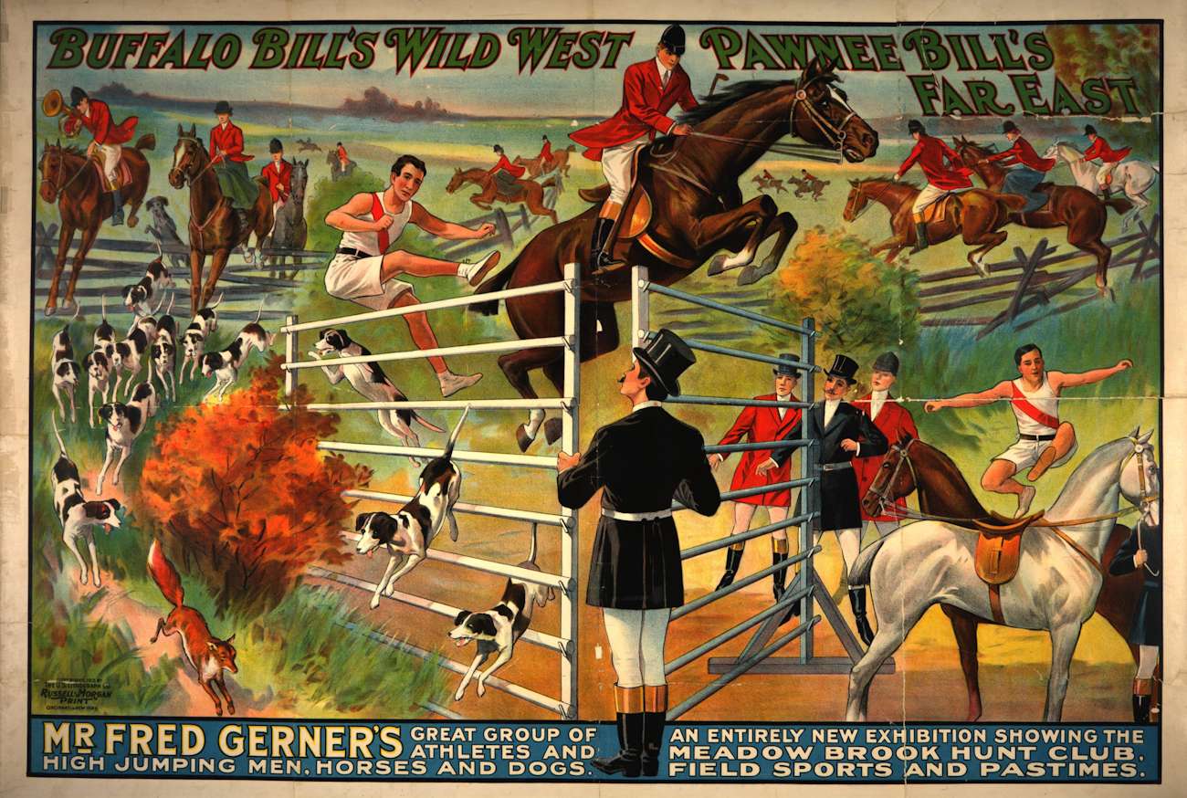 This is a poster for an early 20th-century entertainment show that combines elements of Buffalo Bill’s “Wild West” and Pawnee Bill’s “Far East” shows. The poster advertises the show as “Mr. Fred Gerner’s Great Group of Athletes and High Jumping Men, Horses and Dogs,” and “An Entirely New Exhibition Showing The Meadow Brook Hunt Club. Field Sports and Pastimes.”