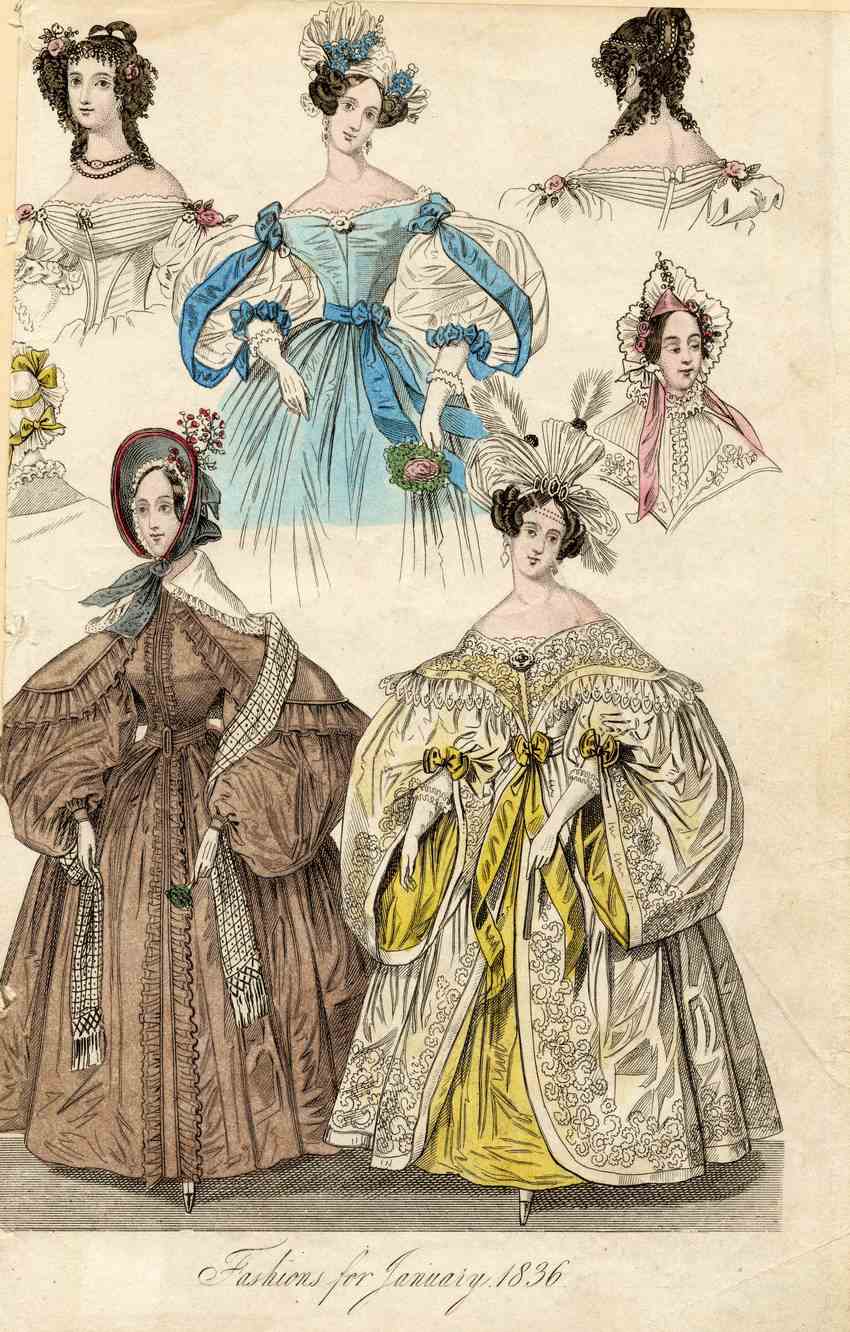 Seven women are shown in fashions for January 1836. The woman in the top left hand corner faces the viewer and is shown from the waist up. She has two pink roses in her hair, which is dressed into a small bun with bunches of curls on the sides, a few long curls on her neck, and short curled bangs. She wears a diadem with a double row of beads, a brooch with three pendant teardrops, and a double strand pearl necklace. She wears an off-the-shoulder white dress with horizontal pleating on the bodice.