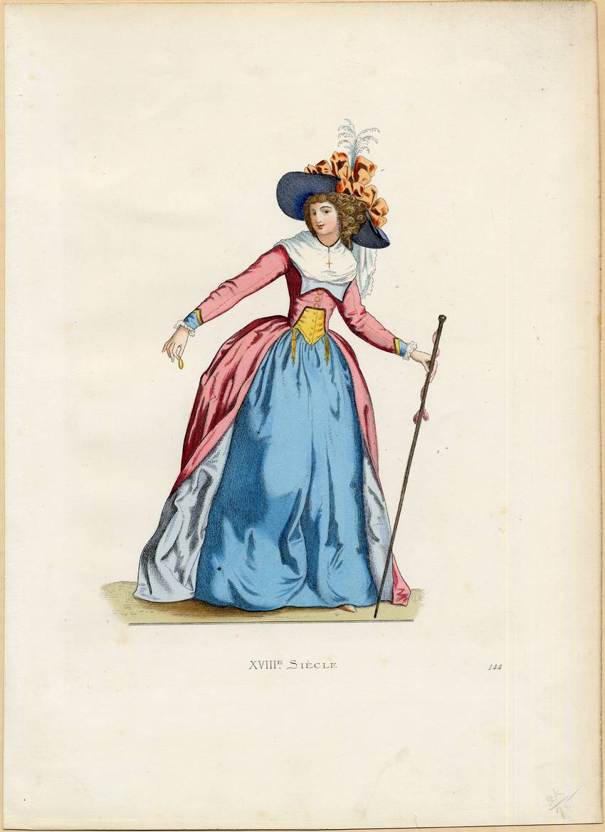 A woman wears a pale pink dress with a fitted bodice with two gold fobs hanging over the underskirt at the sides, and a yellow, buttoned stomacher or waistcoat beneath. The cuffs are banded with baby blue and yellow, and have a narrow lace ruffle at the cuffs. Her overskirt is pink and turned back to reveal the pale blue lining and blue underskirt. Her shoes are pink to match the dress. She wears a cross around her neck on a black ribbon or cord, and a white fichu around her shoulders. The woman’s large, dark blue hat has a group of large orange bows, a plume of white feathers, and a rear veil. In her right hand she holds a small, round golden object. In her left hand is a walking stick with a pink tassel.