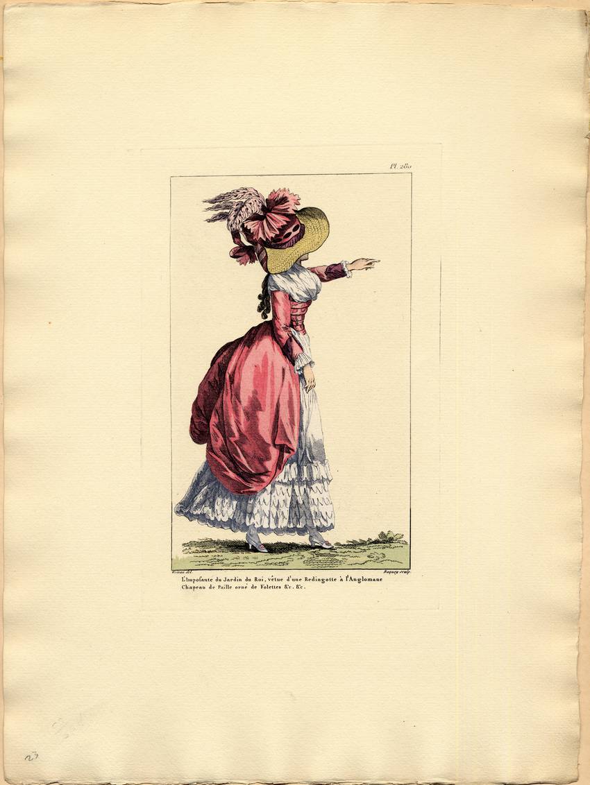 A woman wears a pink redingote with ruffled, white cuffs. The skirt of the redingote is cut away at the front and poufed up at the back. Her underskirt is above ankle-length and white, and has a five or six tiers of lace ruffles at the hem. She wears a white fichu, white stockings, and white high heeled shoes with pink rosettes. Her large straw hat is lined with pink and purple striped fabric and is turned up at the back. The crown is decorated in pink and purple, a large pink pleated cockade, and several pink plumes. The woman faces away from the viewer and points into the distance with her left hand. Though her head is concealed by her large hat, three long ringlets hang down at her back.