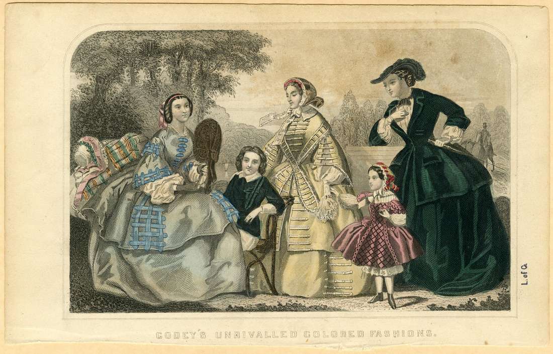 Three women and two children model their circa 1858 fashions outdoors. Trees, a lake, and a man with two horses are in the background. The woman in the center wears a yellow wide skirted dress with elaborate decorations of white horizontal braiding on the front of the bodice, the lower portions of the pagoda sleeves, on bands crossing the front of the bodice and skirt, and down the sides of the skirt.