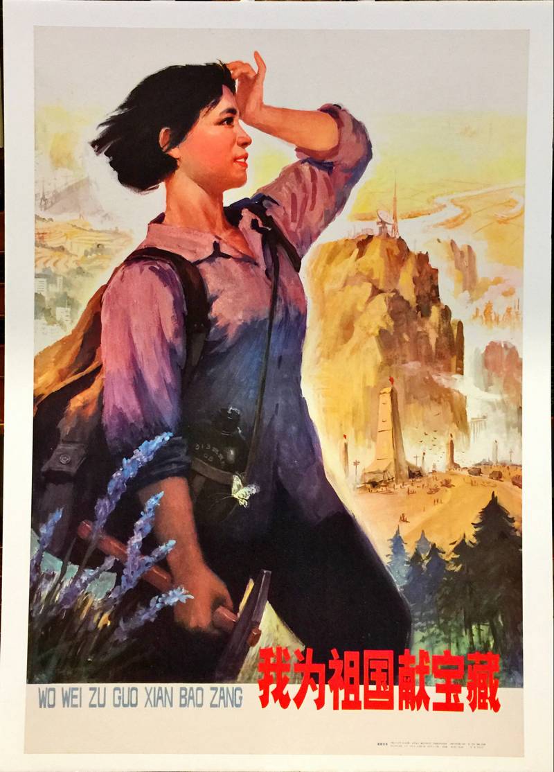 The poster depicts a woman as a geological or mining explorer, symbolizing women’s contribution to China’s industry and national development after the fall of the “Gang of Four.” This type of art was common during the Cultural Revolution era and subsequent periods, focusing on themes such as hard work, natural resource exploration, and industrial progress.