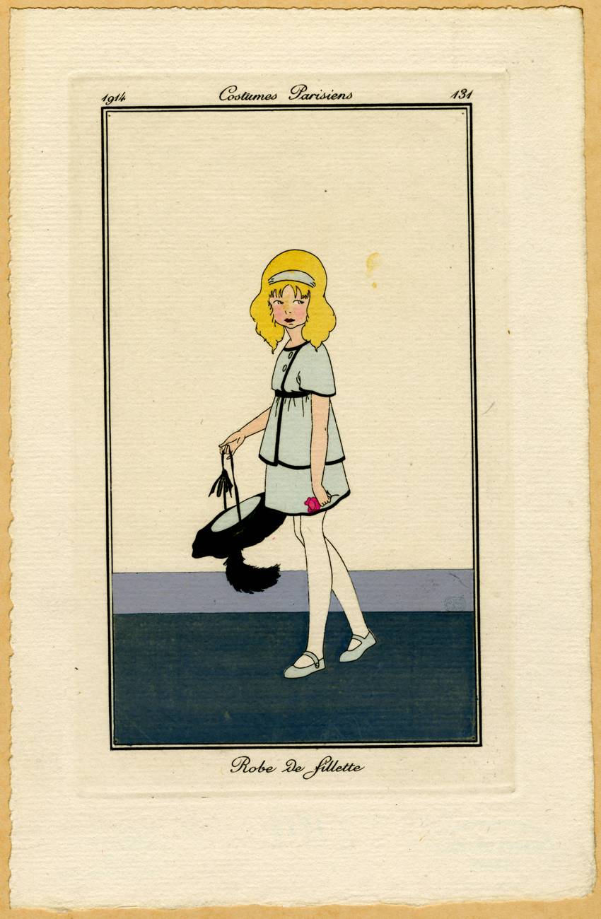 The hems of the tunic and skirt are trimmed with narrow black bands, as is the tunic neckline, sleeve hems, and the left front opening. Matching the pale blue of her outfit are her “Mary Jane” strapped shoes (made popular in 1902) and her headband, which sits above the bangs of her blond hair. Her black feathered hat dangles loosely upside-down from her fingers as she grasps the ribbon ties. She stands against an uncolored background with a simple ground line of green and gray.