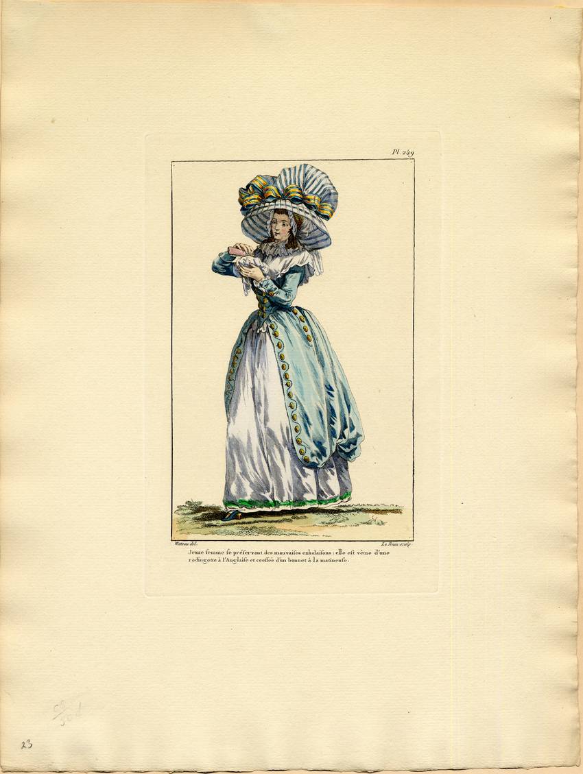 Underneath the bonnet she wears a smaller, simpler, white mobcap with a yellow ribbon at the crown. In her left hand, the woman holds a handkerchief. She seems to be pouring a liquid (possibly a scent or perfume) onto the handkerchief from a pink bottle she holds in her right hand. Written in the lower, left-hand corner is “23.”