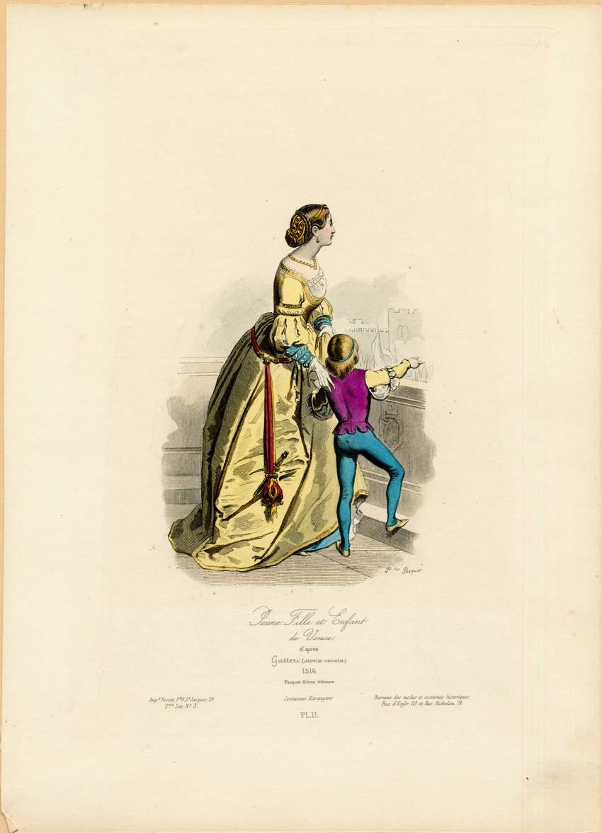 A young woman and a child wear the clothing of Venice during the 16th century. The woman wears a pale yellow, long-sleeved dress with slashing at the elbows, and white gloves. A white chemise with a straight neckline shows in the front of the low scooped neck. Her underskirt is blue and the bottom half of her sleeves are blue, slashed and puffed in narrow rows.