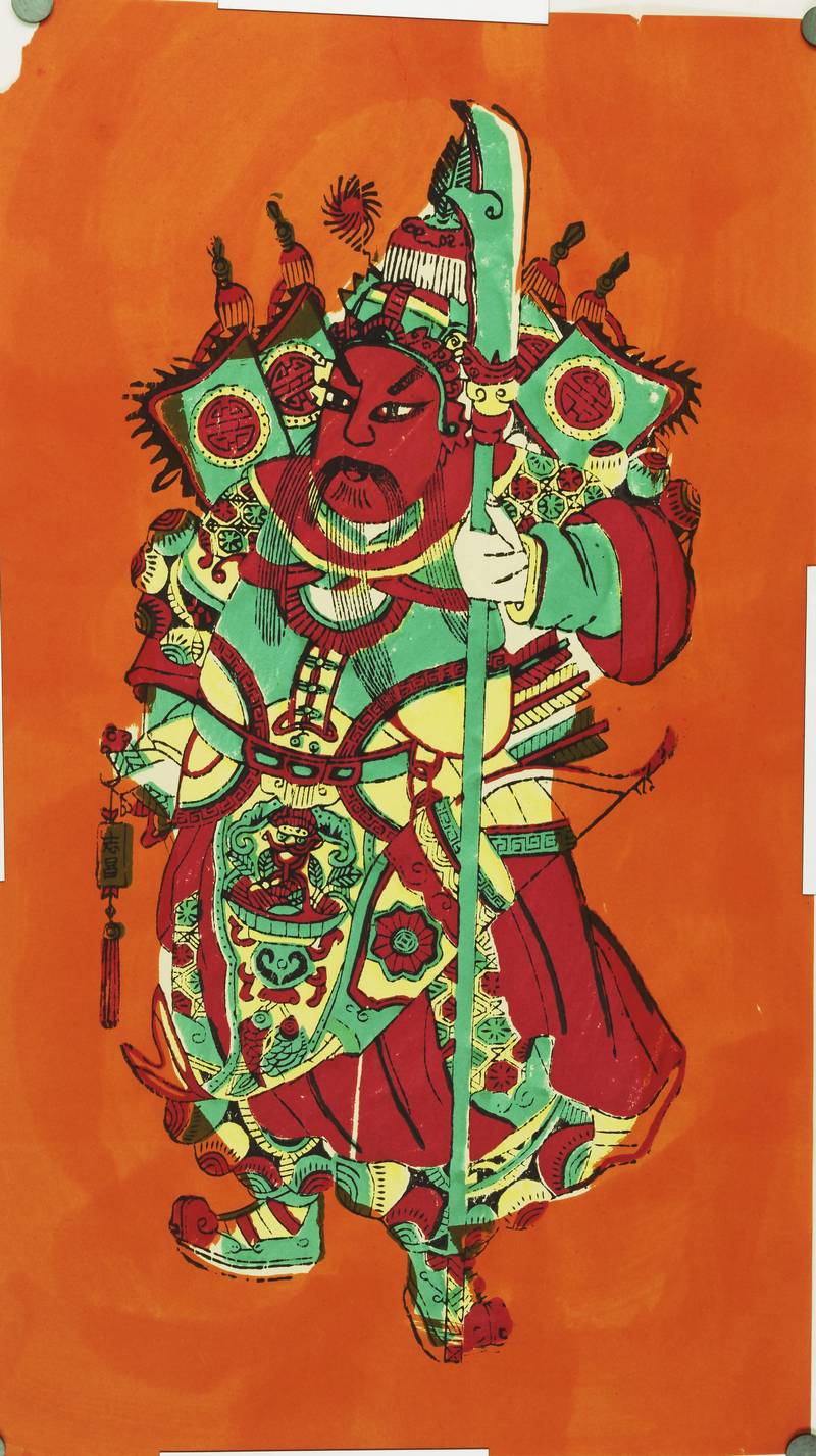 This image depicts a Menshen (Door God), a traditional figure in Chinese folk art used to protect dwellings from evil spirits. Specifically, this portrait is often identified as a representation of Qin Qiong (also known as Qin Shubao) or a general from a traditional story, serving as the “Right Door God”.